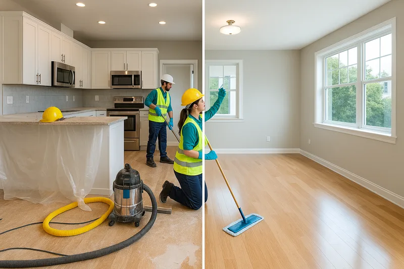 Dust removal (walls, trim, vents, fixtures), interior windows & tracks, cabinets/drawers inside & out, counters & fixtures polished, adhesive/sticker removal, floors vacuumed & mopped.